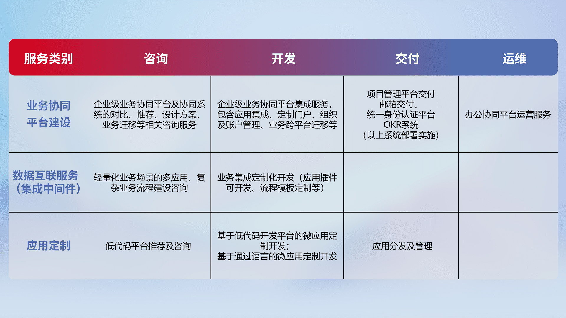 针对钉钉、、、企微、、IDaas等平台级产品提供产品的规划、、方案、、、、交付、、、、定制化开发等服务,,,,实现如统一协同办公、、、智能客户服务、、混合会议管理、、、、智能数据查询、、、等业务场景,,实现数字化转型。。。